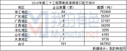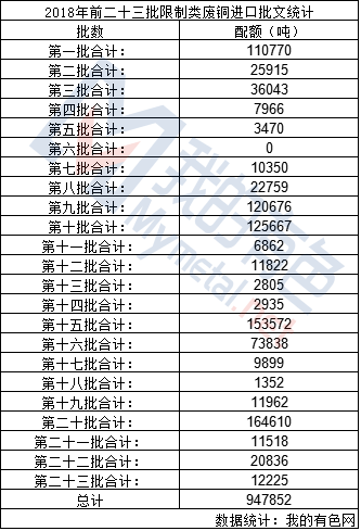 11月1日,2018年国内第二十三批限制类废铜进口的批文的公布,本次批文公布数量为12225吨。在本次公布的批文中,限制类废铜批文中企业6家,位于天津、广东、广西以及江西地区。