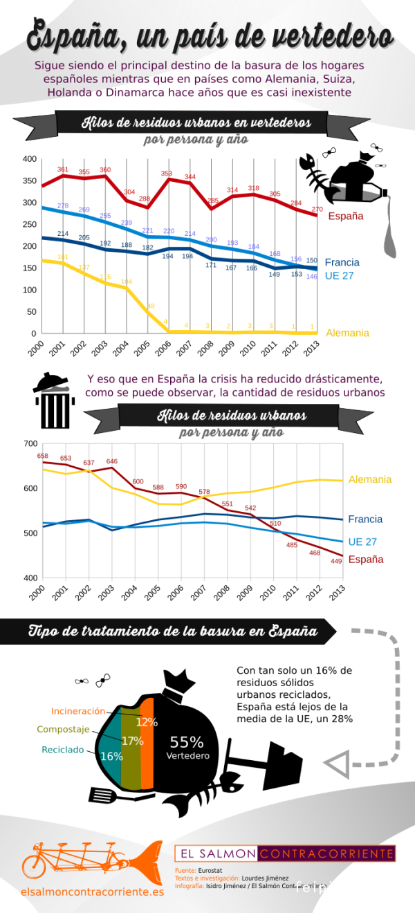 截止2013年的西班牙垃圾处理相关数据。图中上面表格的数据为城市人口年均消费垃圾量, 2000年到2013年间,西班牙(红色线)的垃圾填埋总量,远远超出欧盟27国(淡蓝色线)的平均标准;中间的表格为人均垃圾量,2000年到2013年间,西班牙(红色线)的人均垃圾量减少,是因为遭遇了经济危机;最下方的图为西班牙不同垃圾的占比,黑色为垃圾场填埋垃圾,占55%;橘色部分为焚烧垃圾,占12%;绿色为制肥堆,占17%;湖蓝色16%,是可回收垃圾。西班牙可回收垃圾只有16%, 远远低于欧盟要求的28%。