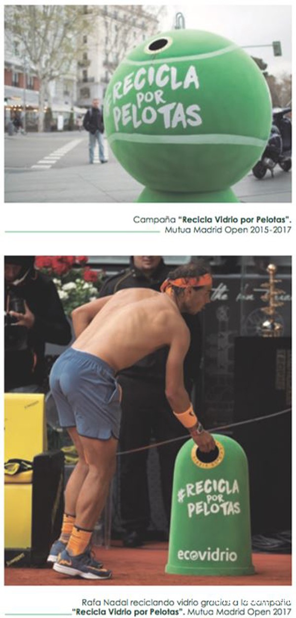 比如关爱乳腺癌活动期间,西班牙投放了一定数量的粉红色回收筒,并表示,每回收三个瓶子,环保组织就会捐献1欧元给与乳腺癌抗争的女性们。举行网球公开赛期间,玻璃回收筒造型被改成网球的样子,还让西班牙国宝级运动员纳达尔(Rafael Nadal)为其代言,让玻璃回收的概念更加深入人心。