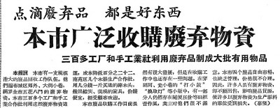据本报1957年3月16日1版《本市广泛收购废弃物资》报道,这些废弃物资帮助了本市许多工厂、手工业生产合作社适当地解决了原料不足的困难。1956年,本市30多个金属生产合作社利用1万多吨烂铁代替新铁板进行生产,度过了停工待料的危机。由于废料价格便宜,产品成本大大降低。第一制毡生产合作社利用废毛和油毡下料代替新毛做出一批帐篷,成本降低22%。南苑区几个木器生产合作社,用几分钱1斤买进的碎木头,做出了结实、美观的家具,挺受顾客欢迎。