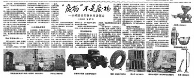 为了让人们树立“变废为宝”的观念,1958年,北京市废品公司在劳动人民文化宫举办了一个半月的“废品回收利用展览会”。本报1958年5月11日2版《“废物”不是废物》记载了当时的情景:悬挂着的宫灯和乐器,是用民间陈旧的硬木家具改制成的;漂亮的被面、床单和枕套是用碎花布拼制的;衣柜、床和桌椅,是用以锯木屑作原料的刨花板制成的;台灯的座儿宛似象牙雕刻,是用废弃的牛骨做的;景泰蓝花瓶,是用回收的废杂铜做的铜胎……