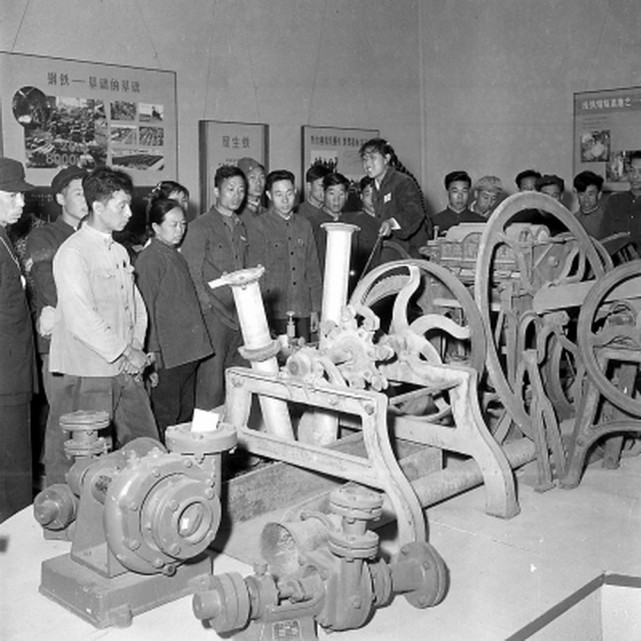 1958年,北京举办“废品回收利用展览会”。图为讲解员为观众讲解用废生铁制成的农具。冯文冈 摄