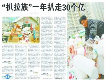 后来,“扒拉族”逐渐发展壮大。2006年市社科院的调查显示:当时北京捡“破烂儿”大军大约有30万人,粗略统计,这些人当中,捡拾垃圾的年均收入约8000元,蹲守垃圾楼或扒居民楼垃圾道的年收入在1万元左右,蹬三轮收废品的年收入最高在1.5万元左右。每年,这些“扒拉族”能“捡”走30亿元。(2006年4月7日《北京日报》8版,《“扒拉族”一年扒走30个亿》)