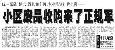 当时,丰台、朝阳、海淀、西城等区进行试点,北京共建立了200个这样的再生资源回收点。收购人员由下岗职工、特困职工以及部分外地人员组成,回收的物品由区物资回收公司统一运作。工作人员要使用统一制作的服装、标识、围栏、器具和车辆,经过专业培训后才能挂牌上岗,比如井盖、电缆和垃圾箱什么的不能收,而易燃品和废铜烂铁要分开放,以免造成安全隐患,影响小区的环境卫生。