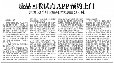 到2017年,东城区已有50个社区在尝试这种服务,注册用户超过两万,日常活跃用户近万个,平均每个月能够回收各类物资300吨左右。(2017年4月11日《北京日报》4版,《废品回收试点APP预约上门》)