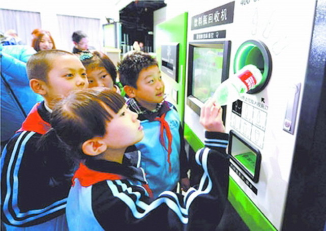 2013年,海淀区首师大附小四季青校区,小学生体验智能饮料瓶回收机。和冠欣 摄